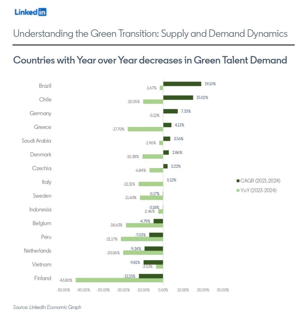 Secondo un’analisi di Linkedin, nel periodo 2021- 2024 la domanda globale di green skills è aumentata del 5,9%, ma solo dello 0,12% in Italia. Tuttavia, nel solo 2024, il trend italiano ha segnato una decisa inversione:
