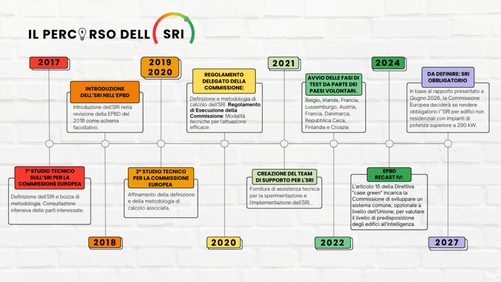 Introdotto come schema volontario nel 2018, è regolamentato dai Regolamenti UE 2020/2155 e 2020/2156. Le fasi di prova sono state avviate in diversi Stati membri, supportate da progetti UE come Smart Square, a cui R2M Solution partecipa. La Commissione europea presenterà entro giugno 2026 un rapporto sui risultati delle prove, decidendo entro il 2027 se rendere obbligatorio l’SRI per edifici non residenziali con impianti di potenza superiore a 290 kW.