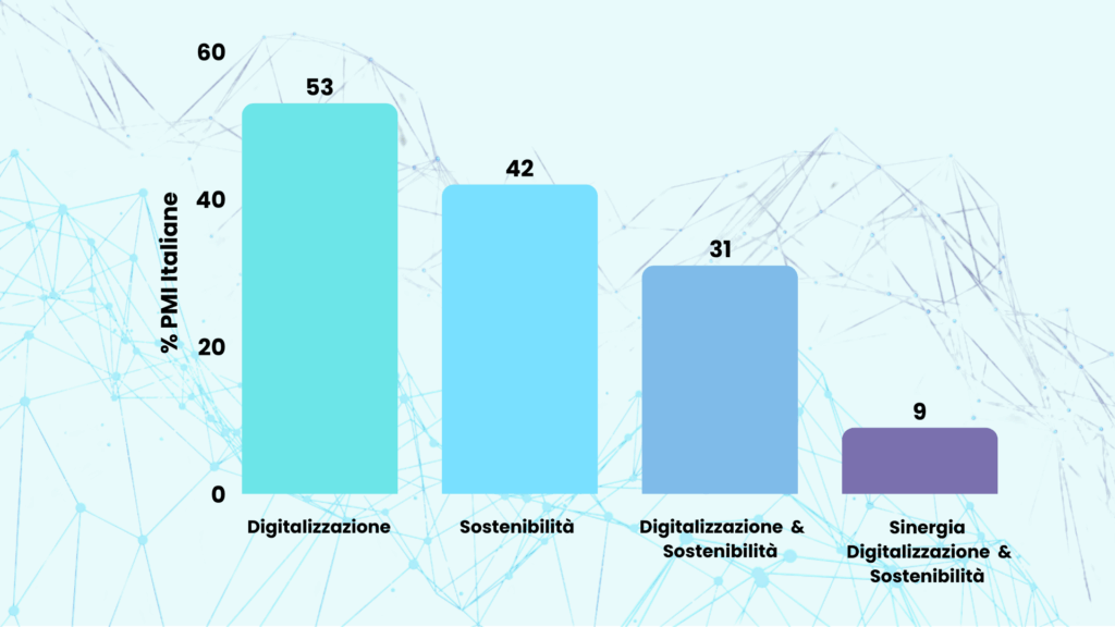 Le piccole e medie imprese faticano ad oggi a tenere il passo delle grandi imprese italiane, che dedicano budget significativi a sostenibilità e digitalizzazione. Solo il 53% delle PMI, infatti, investe significativamente nel digitale e appena il 42% in sostenibilità. Solo il 31% delle PMI integra entrambi gli ambiti, e meno del 10% applica un approccio sinergico tra innovazione tecnologica e obiettivi ambientali.