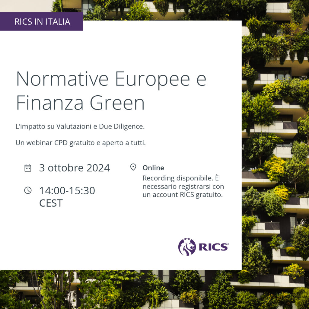 Il 3 ottobre, dalle 15:00 alle 16:30, Alessandro Lodigiani e Lorenzo Cifariello interverranno al webinar in italiano, organizzato da RICS, che offrirà una panoramica completa e aggiornata sulle nuove normative europee e la finanza sostenibile. Questo evento formativo è rivolto a professionisti del settore immobiliare e della sostenibilità che desiderano comprendere meglio l’impatto delle nuove regolamentazioni sulle valutazioni immobiliari e i processi di due diligence.